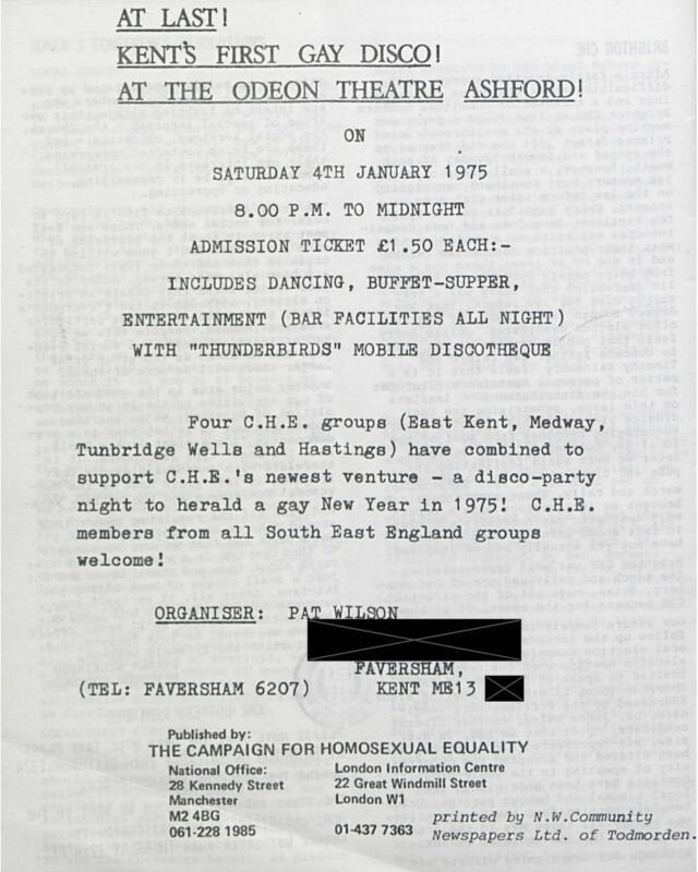 I also discovered that Kent’s first gay disco was organised by a Faversham resident. Pat Wilson was a member of The Campaign for Homosexual Equality (CHE), an early LGBT rights group that was somewhat more conservative than the Gay Liberation Front (GLF). The group had a newsletter and, in the November bulletin of 1974, there is a full page add for a Gay Disco to be hosted at the Odeon Cinema in Ashford for all CHE members in the Southeast. It seems that in 1975, Pat’s partner, Robin, also organized a CHE Disco ‘every 4th Saturday’ at the Sidney Cooper Centre, in Canterbury. Although these events didn’t happen in Faversham, it’s interesting to note, again, that queer people in Faversham were active in the organisation of queer culture elsewhere in Kent.